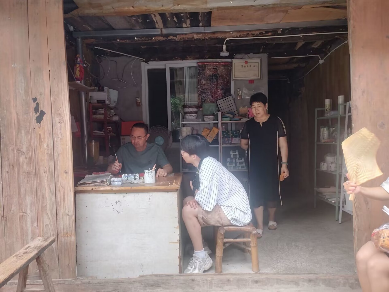 第一位老人是90多岁高龄的老奶奶,精神十足,只是身体功能有正常的老化,和我们聊天时快乐溢于言表。“我大女儿70多岁了,她就在旁边的古镇上忙,早上就把我带这边来让我自己休息。”奶奶年纪大了,眼睛看的不是很清晰,耳朵也不似年轻时灵敏。她坐在门外的木椅上摇着广告宣发的塑料扇子,待我们靠近说话后才发觉我们的到来,她也不住的抱歉,因为没法招待我们,需要我们声音大一些,不住得推脱带来的礼物,“一路一路过来到这里,又热又累的,娃儿些自己拿着吃,我不用。”奶奶虽不是独居,但大女儿也70多了,这对母女就相互依靠着生活在这个小村中,实践队成员在奶奶这里呆了半个多小时,陪她聊了许久才不舍地离开了。