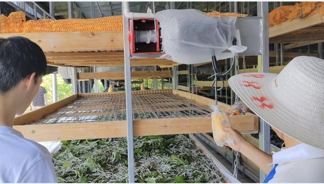 在了解当地的总体情况后,实践团便出发参观了当地带动乡村振兴的主产业——蚕桑养殖基地。养蚕基地管理人员向大家介绍了桑蚕养殖的历史、主要工序、喂养方法以及工厂化养蚕模式,桑蚕养殖包括种桑、养蚕、采茧、加工等工序,其中,种桑和养蚕是桑蚕养殖的核心环节。