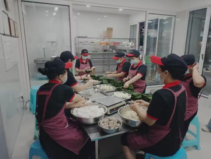 店铺老板许先生热情地接待了团队成员,他指向店内,店员们身着统一服装,佩戴帽子口罩,正在手工制作当天将要出售的叶儿粑。