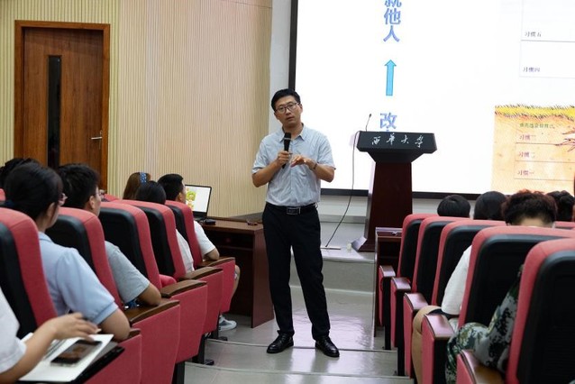 最后,学院党委副书记、纪委书记李强副教授以“新起点、新征程、新奋斗”为主题与同学们进行深入交流。他向新生们表示热烈的祝贺和欢迎,详细介绍了学校和学院发展历程,以及学院在师资队伍、科学研究、人才培养等方面取得的突出成绩。李强副书记从有关“大学的几点思考”出发,回归到人生成长的感悟。他告诉同学们“所有值得去的地方,都没有捷径”!