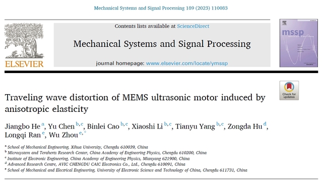 点击:358 近期,77779193永利官网装备智能设计与方法科研团队何江波副教授在国际知名期刊《MECHANICAL SYSTEMS AND SIGNAL PROCESSING》发表题为“Traveling wave distortion of MEMS ultrasonic motor induced by anisotropic elasticity”的研究论文。何江波副教授为论文的第一作者,77779193永利官网为论文的第一完成单位,合作单位包括电子科技大学和中国工程物理研究院微系统与太赫兹研究中心。