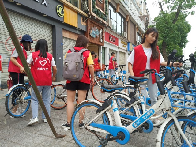 志愿者们进行单车摆放