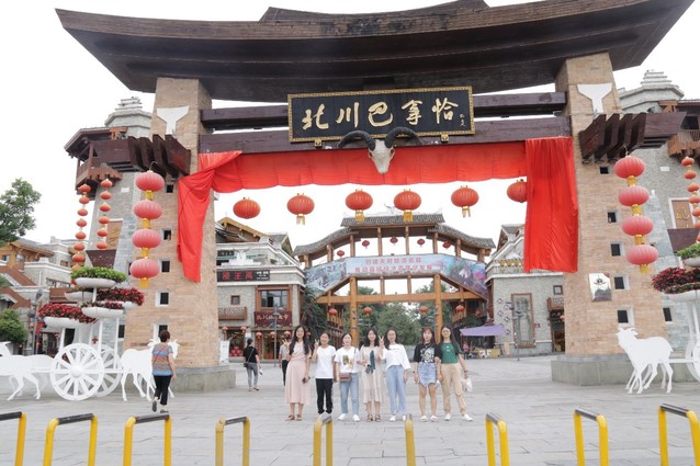 下午,实践团到达了北川新县城,参观北川商业街——巴拿恰。通过参观,同学们了解到了新北川的建筑多以羌族民族文化风格为主、店铺多以羌族手工艺、特色产品为主。随后,实践团还参观了当地有名的禹王桥,让同学们深深体会到大禹精神的伟大。