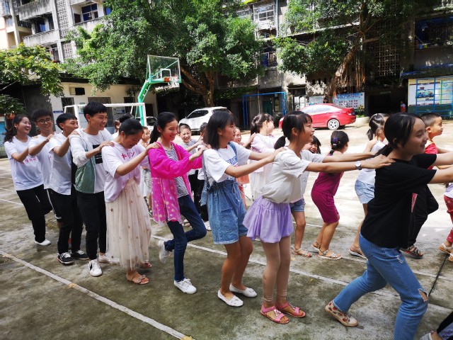 首先调研团进行纸牌运乒乓球趣味运动。调研团将小朋友分为五个小组,每个小组进行比赛,小朋友们要通过接力的方式将乒乓球运到目的地。此运动的目的是培养孩子们的团队协作能力。此后,团队成员教小朋友们跳兔子舞,极大提升了孩子们的肢体协调能力。最后,调研团进行双人夹气球横走运动,按身高将小朋友分两两分成一组,手挽手背靠背夹住气球,完成一个周期的行走,用时最短则获胜,此活动考验了孩子们的默契度。