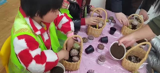 随后小朋友们迎来了最期待的环节——种植多肉。多肉类型多样,有冬云单头、奥普、阿尔巴佳人等等,一颗颗小小巧巧,甚是惹人喜爱。志愿者们给桌子铺上塑料膜,给小朋友们分发多肉篮子,便开始了种植。场面非常欢乐,每一位小朋友都认认真真地填土,浇水,最后在小卡片上写上了自己的名字,以便认领。借着此次机会,小朋友们也画了贺卡送给自己的妈妈,表达出对母亲的赞美和歌颂。