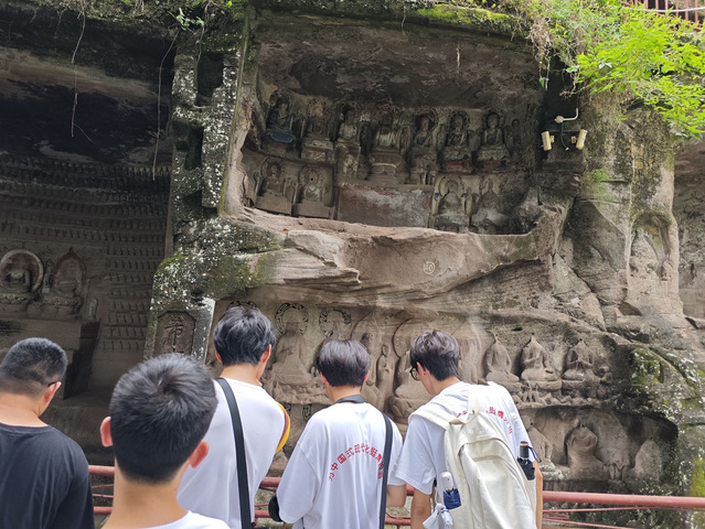 随后,团队来到了圆觉洞,安岳石刻文化传承千年,被誉为中国石刻之乡。在贺老师的讲解下队员们了解到,圆觉洞为国家AAAA级旅游景区、全国重点文物保护单位。现存窟龛103个,造石刻像1933躯,唐、五代、宋时期作品居多,以释迦、净瓶观音、莲花手观音三尊6米多高的大像最为壮观,表达了古代人民对美好生活的向往。