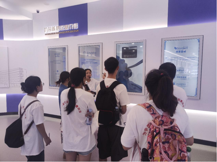 接着,讲解员带领同学们继续了解“牙谷”的产品。比如由四川恒和鑫口腔科技有限公司生产的义齿与传统义齿的改进与创新。还有爱乐慕公司生产的矫治器,与传统钢圈箍牙的相比更加轻便与实用。通过参观医疗产品的生产线,使同学们更加详细生动地了解到如今“牙谷”中的医疗产品与医疗检测设备的蓬勃发展和飞速进展。讲解员亲和、热情的介绍中国牙谷的发展历史与产品信息,让调研师生团队深入了解到“牙谷”的迅猛发展和各个企业如何改进产品的历程与道路,为本次调研工作夯实了主题,进一步开阔了学生视野。