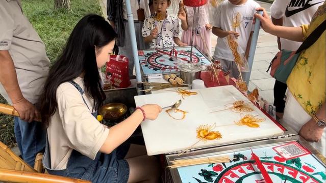 在交谈中我们得知,这位糖画师已经有了近30年的糖画制作经历。他的制作技艺来自于他的祖辈,他自幼便跟随家中长辈制作糖画并以此为生,糖画师表示“糖画作为一种具有悠久历史的传统手工艺术,在中国民间文化中占有重要地位”。从他的口中,我们了解到糖画的发展历程。糖画起源于明代“糖丞相”,历经宋、明、清等朝代的演变与传承,至今已有数百年的历史,进入近现代以来糖画虽然面临一些挑战但在糖画师的努力和社会各界的关注下仍然得以延续和发展。如今,糖画已经成为中国传统文化的一张名片代表着中华民族的文化创造力和手工艺人的智慧与匠心。