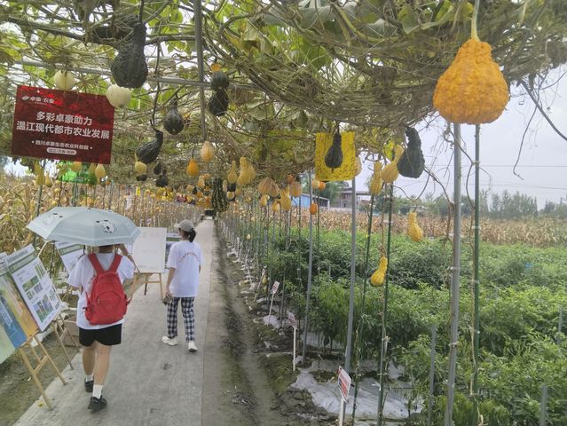队员们到达万春乡村振兴主题公园后,在技术人员的引导下依次参观了泰优808、天泰优808、深两优五山丝苗等卓豪水稻种。队员们通过与技术人员交流,了解到泰优808是籼型三系杂交水稻品种,2023年度超级稻确认品种,株高大约113.5厘米,穗长大约24.1厘米,每亩有效穗数14.1万穗。技术人员说到,泰优808的种植需要根据当地的生态条件,适时早播、稀播匀播,培育多蘖壮秧。参观完泰优808水稻后,实践团又紧接着去到了下一个水稻培育基地——天泰优808培育地。技术人员向队员们介绍到“天泰优808”是国家杂交水稻成都分中心水稻育种攻关的科技成果,集丰产、优质、耐肥抗倒等优良性状为一体,属综合性状好的稻渔专用水稻品种。令队员们最惊叹的就是彩色水稻。彩色水稻简称彩色稻,是指叶色、穗色等为常规的绿色以外的其它颜色的水稻,主要是施用生物农药和绿色肥料,除能观赏外,产出的稻米还可以食用。突变的基因往往可以直接或间接影响水稻叶绿素的合成和降解,技术人员通过改变叶绿素的含量,从而改变水稻的颜色。在参观完成园区的水稻后,实践团随即来到了稻田旁的蔬菜新品种选育、成果转化和精品展示的区域。在这里,队员们见到了许多新奇的蔬菜品种,例如胜似蛇的蛇豆、外形像苦瓜的南瓜、拼色南瓜、吊在棚上的杂交冬瓜以及红七星大蒜等。经过了解,蛇豆又名蛇瓜,是葫芦科栝楼属的一年生攀援藤本植物。其不仅可以作为美味的蔬菜食用,其种子还可以用作泻存杀死肠道寄生虫。参观结束后,实践团还去到了主题公园的党群服务站,了解到当地从曾经的岌岌无名的村镇到如今的“国家乡村振兴示范镇”、中国“千强镇”,一路上的科技赋农的力量和当地人们拼搏奋斗精神。