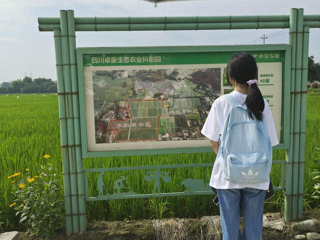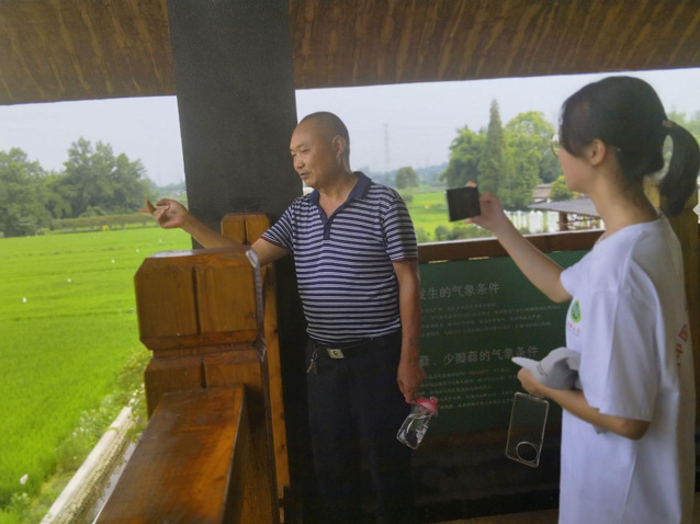 实践团前往水稻种植区,一路上周围都是绿叶水稻,大部分水稻仍处于绿叶状态,还没有生长出幼穗。万春和林村大部分农作户种植水稻或者绿植,坚持“绿水青山就是金山银山”。除了绿植、水稻外,实践团在路上看见卓豪农业坚持井冈山精神、红旗渠精神、脱贫攻坚精神,坚定不移的革命信念,坚持党的绝对领导,密切联系人民群众的思想作风,把自身工作与革命精神联系起来,开展生态农业科创园。在适当的季节时期,和林村科创园还会开展“亲子农耕文化活动”,不仅吸引了更多游客,还让孩子亲自在田间体验“春种一粒粟,秋收万颗子”的全过程,发展“旅游+教育”的新型旅游业态。抵达水稻种植区后,实践团采访了几位农户,学习到不同时期的水稻管理的方式也不同。水稻的每个生长周期都十分重要,为防止倒伏、落黄等情况的发生,村民们会采取相应的措施。实践团根据农户的讲解,针对当前水稻的生长状况分辨了处于什么时期,对水稻的生长有更深刻的认识。下午2时,实践团采访到和林村“熊猫水稻”的设计者和种植者之一,通过专业人士的描述,队员们了解到“熊猫水稻”是通过绿叶稻、紫叶稻和黄叶稻相结合设计的。首先由团队设计出熊猫和当地标识的图案,再到水稻田中通过不同颜色的水稻种植来进行点缀,随着水稻的生长,不同颜色的水稻就会明显区分出来,形成特别的图案。随后,实践团参观了水稻种植的机械,并认识了生物防治的相关植物,实践体验了水稻的种植。此外,队员们还了解到农户注重种子量、育秧基质、播种、苗床整理、摆盘、水分管理等方面,他们对于种植水稻有大量的经验,而各种水稻的生长、“熊猫水稻”的形成都是他们对水稻的理解。