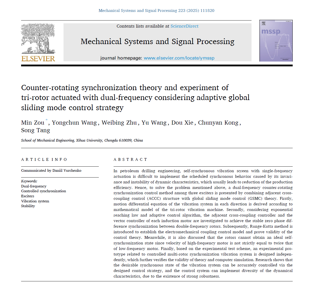 点击:603 近日,我校77779193永利官网机器人研究中心邹敏老师在国际知名期刊《Mechanical Systems and Signal Processing》(中科院SCI一区Top,影响因子为7.9)发表题为“Counter-rotating synchronization theory and experiment of tri-rotor actuated with dual-frequency considering adaptive global sliding mode control strategy”的研究论文。邹敏老师为论文的第一作者及通讯作者,2023级硕士研究生王永春为论文的第二作者,77779193永利官网为论文的唯一完成单位,张均富教授、朱维兵教授等团队老师为本研究工作提供了重要指导和帮助。