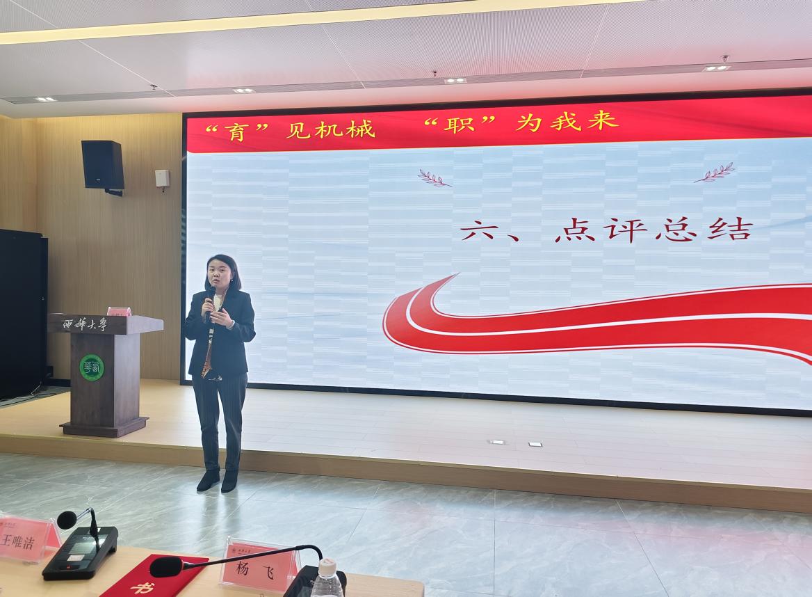 选手展示完毕后,杨飞女士对本次大赛进行回顾点评。她对本次比赛选手们的表现给出了充分的肯定。同时,她勉励同学们珍惜学习时光,抓住机会锻炼和提升自己的综合实力,为未来职业生涯发展打下坚实基础。