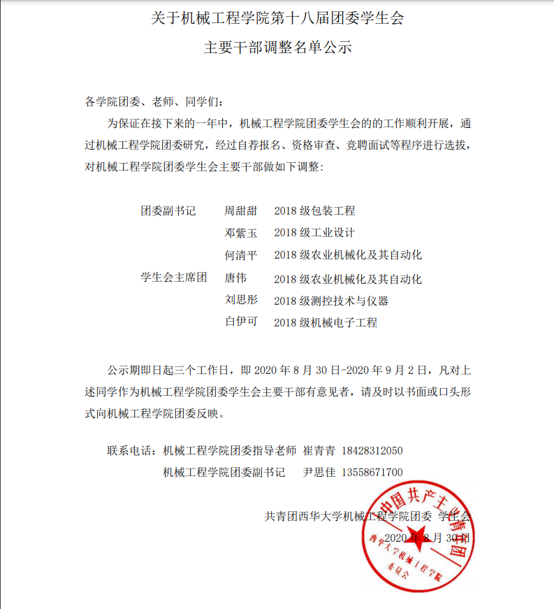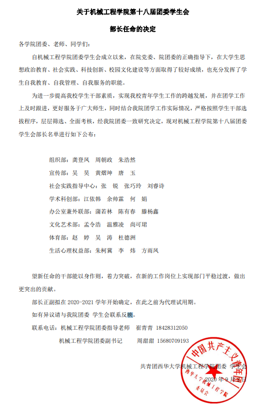 最后,严格按照学生干部选拔程序,层层筛选、全面考核,经永利官网团委一致研究决定,现对77779193永利官网第十八届团委学生会全体干部名单进行如下公布: