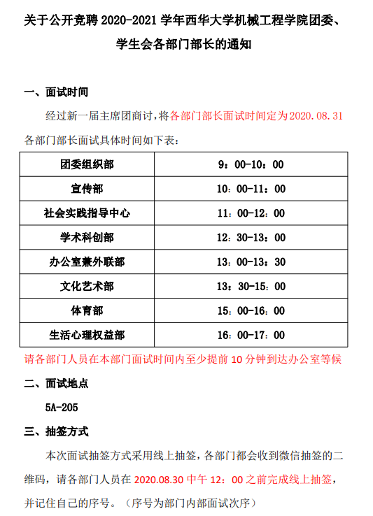 各部门面试顺序为团委组织部、宣传部、社会实践指导中心、学术科创部、办公室兼外联部、文化艺术部、体育部、生活心理权益部。同时按照顺序分开进行面试从上午9点至下午17点。本次面试顺序采取线上抽签的形式,每个部门参加面试的人员通过微信抽签的二维码决定部门内部面试顺序。