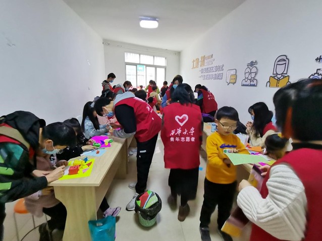 志愿者与孩子们一起做折纸手工作品