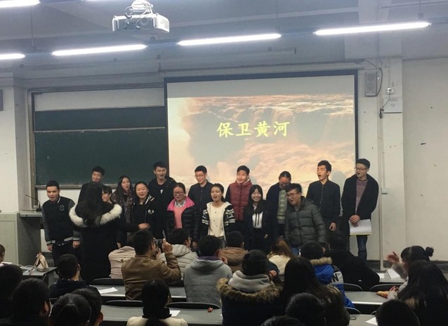 在主持人简短的开场之后,晚会在同学们嘹亮的国歌声中拉开序幕。首先,晚会播放了一段关于“129爱国运动”的视频资料,点燃了同学们的热情,紧接着便是此次晚会的重头戏——由学院团委学生会各部门组织的表演节目。各部门的表演都是以红歌为主、辅以各种表演形式,由此来歌颂爱国精神,展现爱国情怀。唱歌、朗诵、情景剧、甚至是舞蹈,以及穿插在节目之间的问答小游戏,都带起了晚会一波又一波的高潮,学生会的各位可谓是将自己的表演天赋表现得淋漓尽致,最终晚会在气氛轻松活跃的猜歌小游戏中落下帷幕。