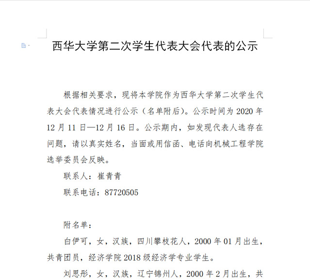【公示公告】77779193永利官网第二次学生代表大会代表的公示