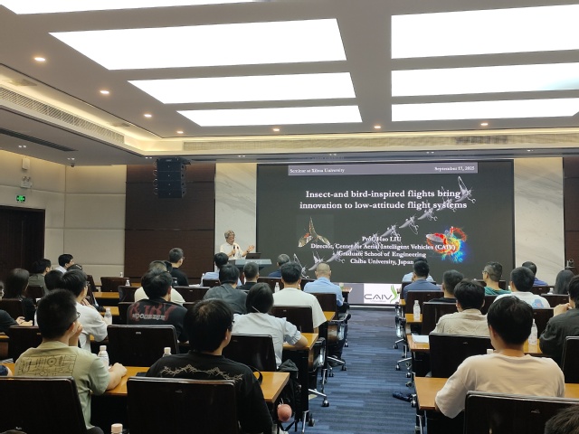 刘浩院士详细分析了不同生物在低雷诺数环境中飞行的相关物理特性,以理论、计算和实验相结合的角度分析生物启发低空飞行系统领域的核心技术方向,分享了本领域的主要研究成果,并展望未来重点研究方向与挑战。在场师生就生物启发低空飞行系统领域相关关键技术与刘浩院士进行交流与探讨。