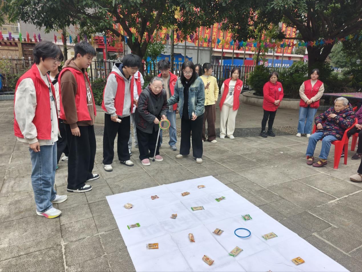 在 “击鼓传花”“套圈游戏” 环节中,志愿者们全程陪伴,现场笑声不断。随后,志愿者带领老人们共同演绎《大中国》手势舞,热情的旋律、简洁的动作让老人们兴致盎然,在抬手投足间传递爱国情怀与青春活力。活动尾声,老人们和志愿者分享革命故事,弘扬革命精神。