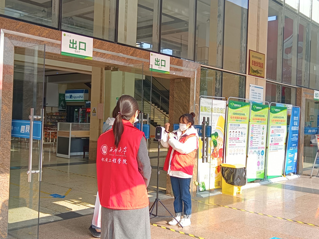 本次活动分为早、中、晚三个时段进行,各时段志愿者根据77779193永利官网志愿者服务队的安排到达77779193永利官网四食堂,在四食堂的出入口引导学校师生佩戴口罩,并有秩序地进入食堂就餐。活动过程中,志愿者们坚守岗位,当看到有同学或老师未佩戴口罩时,及时提醒同学和老师佩戴口罩后再进入食堂就餐。同学与老师们也积极配合防疫工作,坚持在食堂门口的体温计上进行体温测量后,佩戴口罩进入食堂,时刻关注自身体温情况,强固疫情防线。