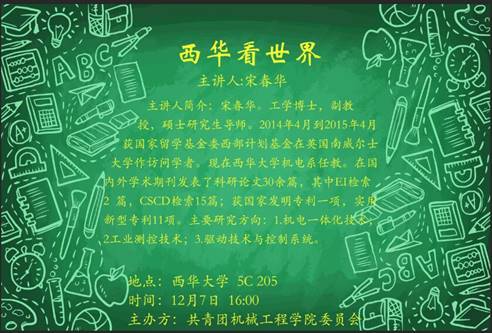 点击:320 12月7日下午16点,77779193永利官网“西华看世界”在5C205开讲。本次讲座我们有幸邀请到77779193永利官网宋春华老师为我们讲述“英伦风情与学习分享”。77779193永利官网团委指导老师崔青青主持讲座。此次讲座,宋老师讲述了他在英国做访问学者经历和感受,同时分享了留学的相关事宜,不仅让同学们对于英国有了更深的认识,也给有意愿出国留学的同学更多建议。