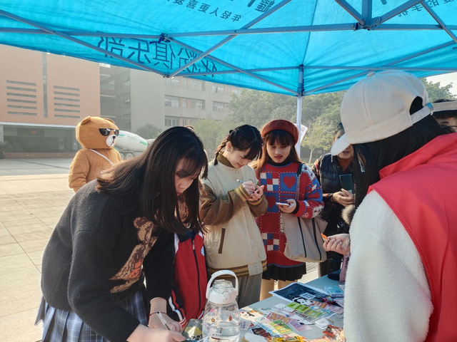 上午9点,志愿者们在团委办公室集合进行物资的清点并将其搬运至相应的点位进行布置。活动主要由给志愿者写一句感谢的话、问卷调查和趣味小游戏三个部分组成。活动过程中由一名志愿者穿戴吉祥物服装在广场上吸引校内的同学们参与到活动当中,其他志愿者负责给来参与活动的同学介绍活动规则,引导参与者们完成问卷调查。参加活动的同学都在纸条上为志愿者们写下了他们的感谢与祝福,而且在后面的趣味小游戏环节中,“投壶”游戏获得同学们的一致喜爱。活动不断吸引着新的同学参与,随着白板逐渐被祝福语所占满,活动在欢声笑语中于下午5点圆满结束。