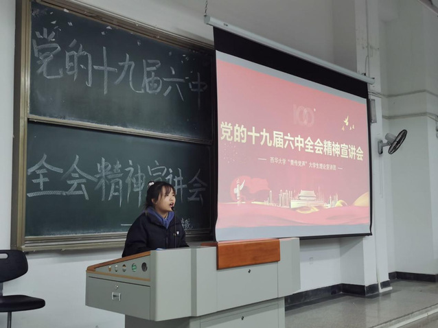 宣讲会开始刘睿诗带领全体学生学习了第十九届六中全会内容。首回顾建党百年来,四个时期的主要任务、面临的挑战以及各时期取得的伟大成就。不同时期下,中国共产党有新的认识、新的挑战、新的观念,但也正是中国共产党迎难而上、攻坚克难、不断调整才有了中国特色社会主义道路。十九届六中全会新决议内容显示了中国在政治、文化、经济、社会等各方面建设中,不断自我转变、自我改革,由此开创了中国特色社会主义新时代。