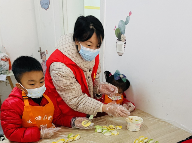 志愿者协助小朋友包饺子