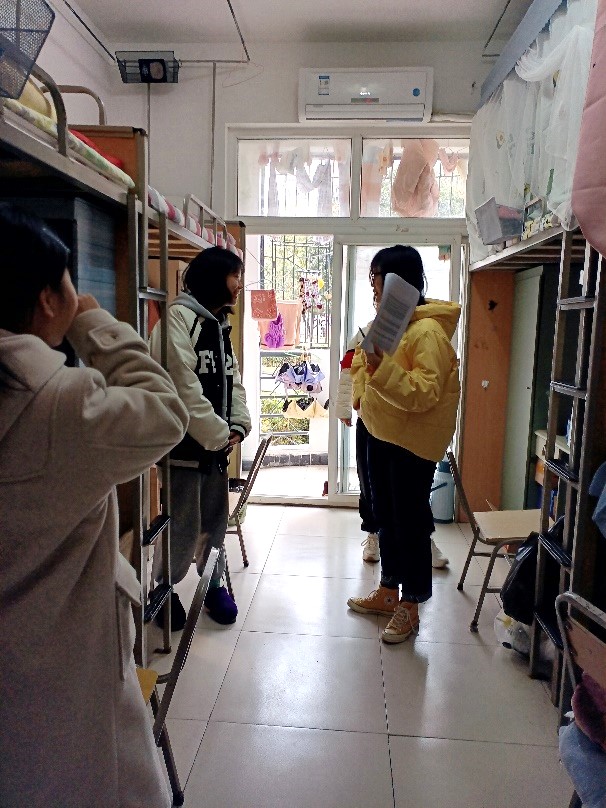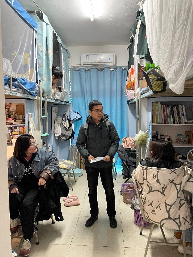 新学期伊始,21级辅导员陈昶、廖傲梅逐一走访学生寝室。通过扎实开展调研,掌握新学期学生心理动向和热点关注,及时解决学生们最关心、最迫切的学习和生活问题,帮助学生收假收心,引导学生正确看待和应对学习压力,迎接新学期的到来。
