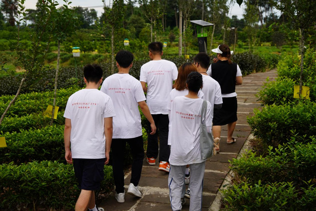 在了解了手工制茶工艺之后,调研团紧跟讲解员的脚步,来到了科普茶园。茶园有序种植各类茶品,有饱含花青素为人追捧供不应求的“紫嫣”茶,也有为人们熟知的“龙井”茶,冲泡后“色如白水”却饱含茶香的“白茶”等各色茶品。据讲解员说:“茶树浑身都是宝”:茶叶可冲泡调理,茶根、茶花可晾晒后均可入药,有清热止血之功。茶树果可以压榨成油,具有较高的营养价值。而作为浦江县特产茶叶的“蒲江雀舌”,因其新发的嫩芽形状如鸟雀的舌头,很细小,故称为雀舌。“蒲江雀舌”是“中国地理标志产品”,入选了“中国农产品百强标志性品牌”。这种雀舌茶叶因其“色翠、香高、味醇、形美”,品质上乘,香高味爽。曾连续三届获得“中茶杯”一等奖,入选“全国农产品区域公用品牌价值百强”。