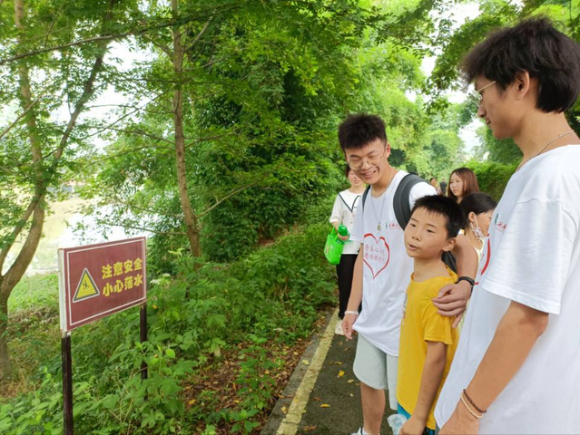 斑驳的墙面,留下一年又一年的印记,一排排房屋整齐排列,檐角向上轻轻翘起,似乎是一个绝美的笑容。褪色后的红砖青瓦也倍显沧桑。了解完古镇的非物质文化遗产传承以后,志愿者带着小朋友们走出古镇的街道,来到了古镇旁边经过人工修饰的河流。走在河岸,微风时而拂过小朋友的脸庞,小道两边的景色也为旅途增添了不少的乐趣。夏日炎炎,阳光逐渐从温柔,转为热烈,志愿者们一边跟小朋友在河岸走着,一边跟小朋友们传授着夏日防溺水的安全知识。让小朋友们成功的意识到了安全的重要性,必要性。
