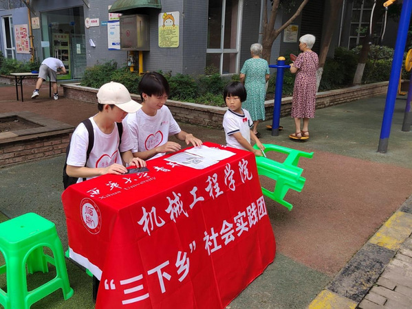 在活动正式开展前一天团队志愿者与社区进行联络交接,当天下午在社区内进行踩点与前期宣传工作。经过简单的商讨,犀浦村社区为本次活动提供了场地以及在小区业主群内对夏令营活动的宣传。宣传工作进行当中团队成员了解到许多儿童的家长在白天因为要上班而无法照看已经放暑假的孩子,其余家庭中因为由爷爷奶奶需要照看更小的孩子,往往疏忽了对于偏大的孩子的关心。这在儿童心理成长关键时期的小学生是一种隐藏的危害,本次的活动填补了小学生放假的空余时间同时对于家里无暇照看的小朋友进行托管,对于家长和小朋友来说都是意义丰厚的。