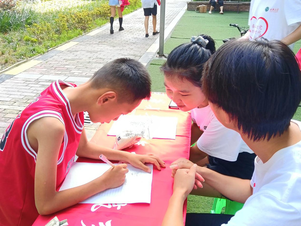 小朋友在报名点位现场签字报名 守望者实践团队成员熊桢雁供图