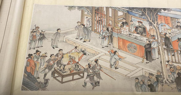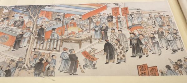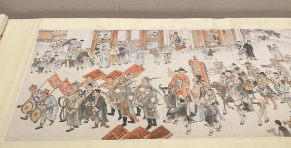 《迎春图》一套分为四件,横卷彩绘年画手稿保存完整,每件纵48厘米,横150厘米,其内容分别为迎春、游春和打春牛的情景。迎春情景中身着朝服的县令坐着彩轿主持县城的迎春活动,率领所属文官,并出动官府所有的仪仗队,举着巨大的春牌,鸣锣击鼓、吹吹打打到东门外的先农坛迎接春神的降临。尤其值得注意的是,在画面上迎春队伍中一名县衙执事,高举着一面上书“署调绵竹县正堂”的执事牌。