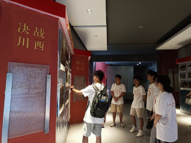 随后队员们怀着对这些烈士的敬佩与尊重继续向前迈进,前往成都战役纪念馆,一位队员说到“我们没有什么资格说累,在中国共产党红军的万里长征的进程中,我们连他们的万分之一不及。”终于队员们抵达了成都战役纪念馆。馆内展陈有各类书籍21本;参战老兵捐献物品;各类徽章、钱币9枚;马识途、王晓、左良等人的题词4副;维和烈士李磊的遗物。这里的一件件烈士们留下来的遗物无不都在诉说着无数英勇的先辈们光荣而无悔的故事。曾经,是他们用成河的鲜血换来了成都的解放,也让全中国的解放道路接近尾声。随后队员们来到纪念馆外面的入党誓词下面,举起右手拳头与耳根部高,并且下半身以正位角姿势站好,一起喊出了“不忘初心,牢记使命”。