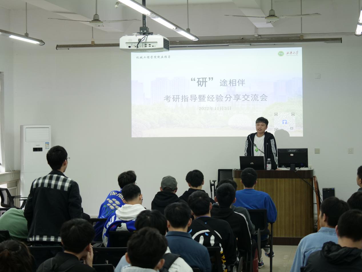 随后,两位学长结合自身考研经验和目前学习感悟向学弟学妹做经验分享。机械电子工程专业2016级的蒋恒学长在会议上讲到如何根据自己的成绩确定考研目标,如何选取适合自己的院校和专业,以及如何规划安排自己课程的复习。学长还分享了在考研课程上的复习方法,以及在考研过程中所遇到的困难,并分享了自己的日常学习时间安排。机械设计制造及其自动化专业2016级的王政伦学长就考研的时间规划和学习方面安排进行建议,提到要充分利用时间,提前制定学习目标,并提及了一些生活上的人际交往的建议;然后,学长又介绍如何选择院校,如何根据自身水平选择院校,提到要根据所发展的城市以及专业对口来选择院校及专业。之后又介绍了夏令营活动,讲述了其相关作用,为考研学子提供了更多选择。