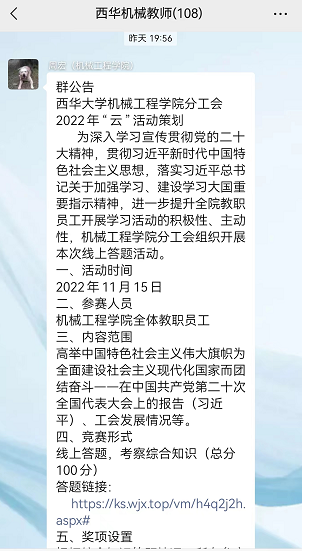 为深入学习贯彻党的二十大精神,学院分工会创新工会活动方式,组织全院教职工开展党的二十大知识的线上问答活动。本次工会“云活动”融教育性、趣味性为一体,从15日持续到18日,全院教职工积极参与,反响热烈。