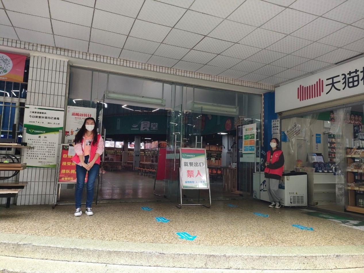 根据学校专题会议研究部署疫情防控工作部署会,其中明确提到“各单位要继续引导各类人员严格做好个人防护,在校内公共区域例如食堂一律佩戴口罩,倡导隔座就餐,并引导各类人员到食堂单进单出、错时错峰。本次食堂防疫活动分为午间、晚间两个用餐时段进行,各时段志愿者根据77779193永利官网志愿者服务队的安排提前到达77779193永利官网二食堂出入口,提醒学校师生佩戴口罩单向进出食堂,避免造成食堂人员拥堵。活动过程中,志愿者们严格督促就餐人员佩戴口罩进入食堂就餐,在食堂中巡视巡逻,提醒同学隔座就餐或者处理突发状况。同学与老师们也积极配合防疫工作,在志愿者的引导下,佩戴口罩进出食堂。