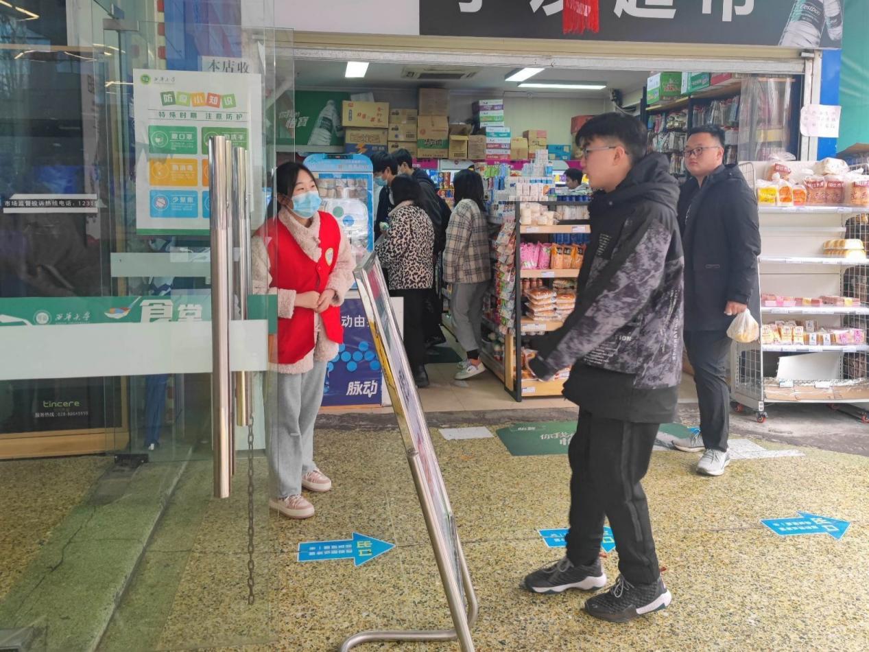 志愿者劝导同学佩戴口罩进入食堂就餐