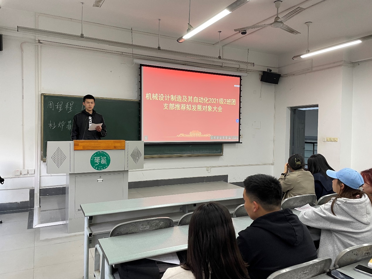 大会进行第二项,召开团支部推优大会。候选人杜烨菲、周程程、张思蕊、周贤臣、杨冬燕依次汇报了对党的认识、入党动机、本人履历和主要社会关系情况。整个推优流程程序规范、票选结果无异议。