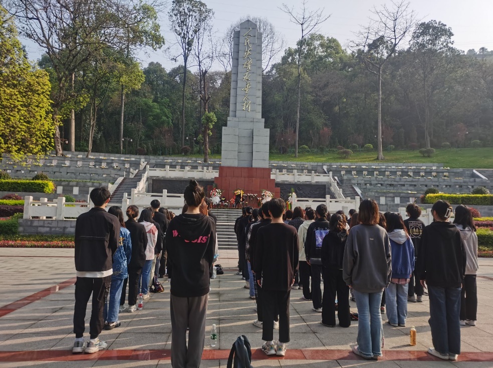 上午九点,在老师的带领下,全体成员统一深色服装,佩戴团(党)徽乘车到达宜宾市烈士陵园。在周老师的的指导下,全体成员整理着装、排队肃立、高唱国歌、低头默哀、气氛庄重严肃。四名学生代表手捧鲜花向烈士献花,全体三鞠躬表达敬意,随后全体成员高举右拳,在纪念碑前庄严宣誓。最后全体成员有序瞻仰烈士纪念碑和烈士纪念馆,了解先烈事迹,传承革命意志。