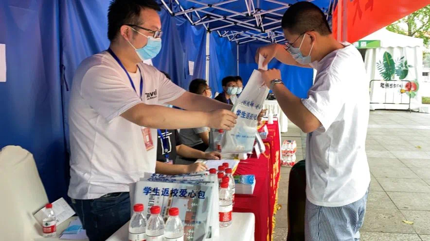 当天,返校学生向安保工作人员出示有效身份证件和“青柠疫--高校疫情防控平台”上生成的返校电子凭证,接受体温检测,合格后依次进校。